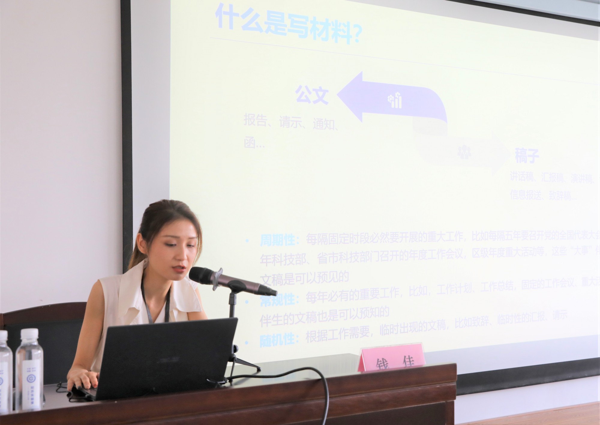 针对写文章“肚子没货”的难题,钱佳从“注重积累、善于模仿、多写常练”三个方面给出建议。她向大家介绍了不同公文体例及其对应版式、格式,同时详细讲解了公文起草的基本要求和一般步骤,“问、搜、搭、写、顺、高”的六字口诀朗朗上口,让大家受益匪浅。